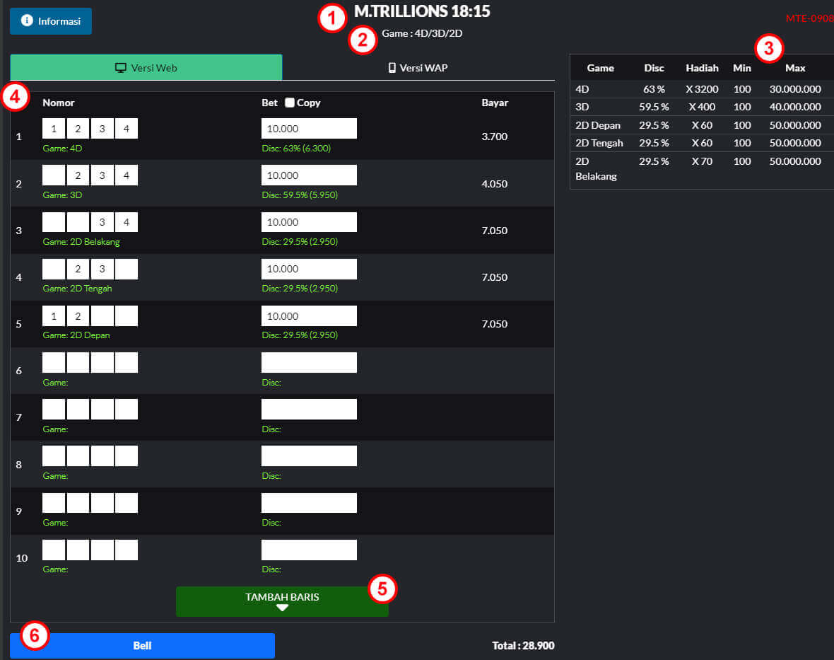 Contoh : Member ingin bermain taruhan 4D 3D dan 2D